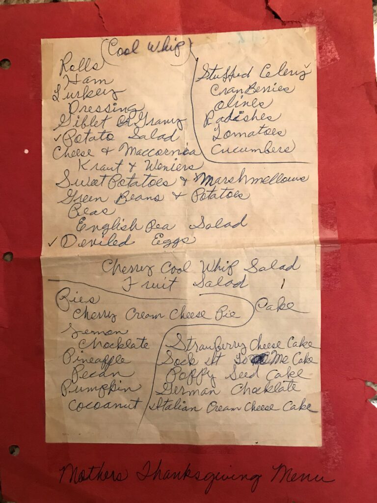A few years ago, my stepmom shared with us kids my grandmother’s handwritten menu for Thanksgiving. Growing up, we would get together, and all this food would just appear. No matter if we were eating at Granny and Granddaddy’s or one of my aunts’ houses, counters would be covered with turkey, ham, side dishes, pies, and cakes. I specifically remember eating so much one year that all I could do was lay on the floor and try not to move.